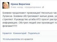 "Боевики продолжают провокации! Несколько часов идет бой в районе Луганска. Боевики обстреливают жилые дома, украинские военные не стреляют. Руководство штаба АТО просит распространить эту информацию..Обстрел людей они (боевики) производят под украинскими флагами!!!!!!", - сообщила И.Веригина.